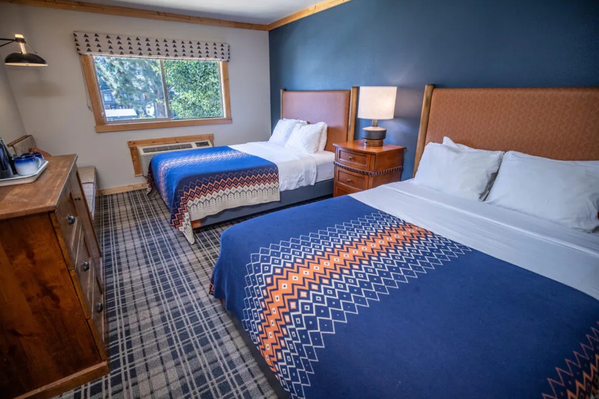 Go ahead, sleep in a little. Our Deluxe Two Queens hotel room in Mammoth Lakes, CA, is filled with cozy local details like a pour-over coffee maker and feather-soft beds for four. Located in the main lodge, this room is dog-friendly and can be adjoined with another Deluxe room or Fireplace Suite.