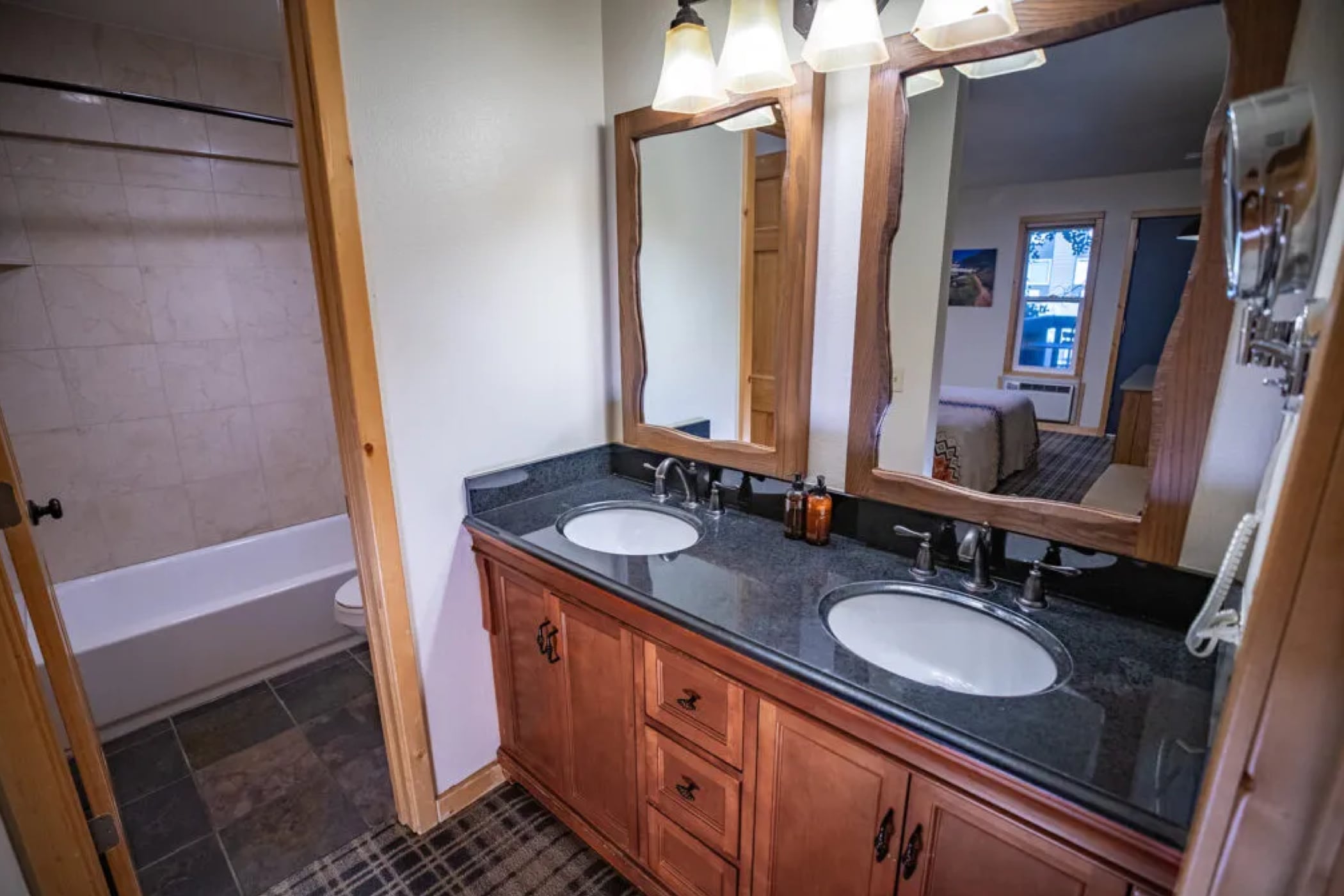 Sleeping arrangements include a King bedroom and two ground-level rooms (one King bed and one Double bed), each with its own ensuite bathroom and lock-off entrances. With 1,300 square feet of space, these cabins in Mammoth Lakes are a welcoming home base for your Mammoth adventure.