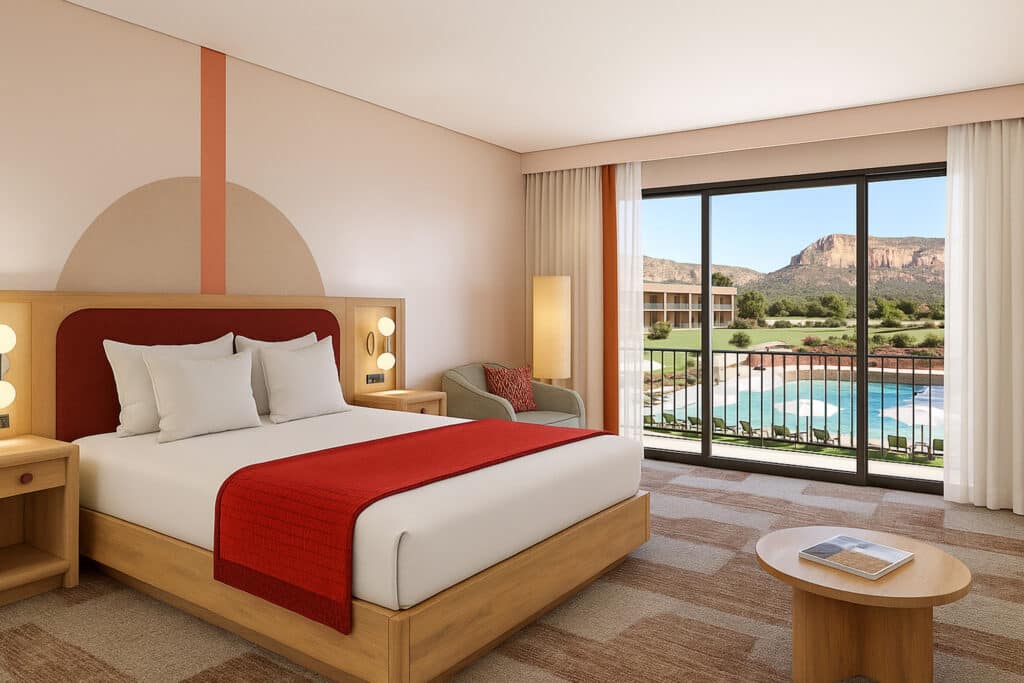 Relax above it all. The Pool Balcony King offers elevated views of the Moonwater Pool and the surrounding red rocks, framed by Sedona’s golden light. Step onto your private balcony for sunrise reflections or unwind inside amid soft desert tones and handcrafted finishes. Spacious yet intimate, this room is the perfect blend of connection and calm—made for those who love the beauty of Sedona from a higher perspective.