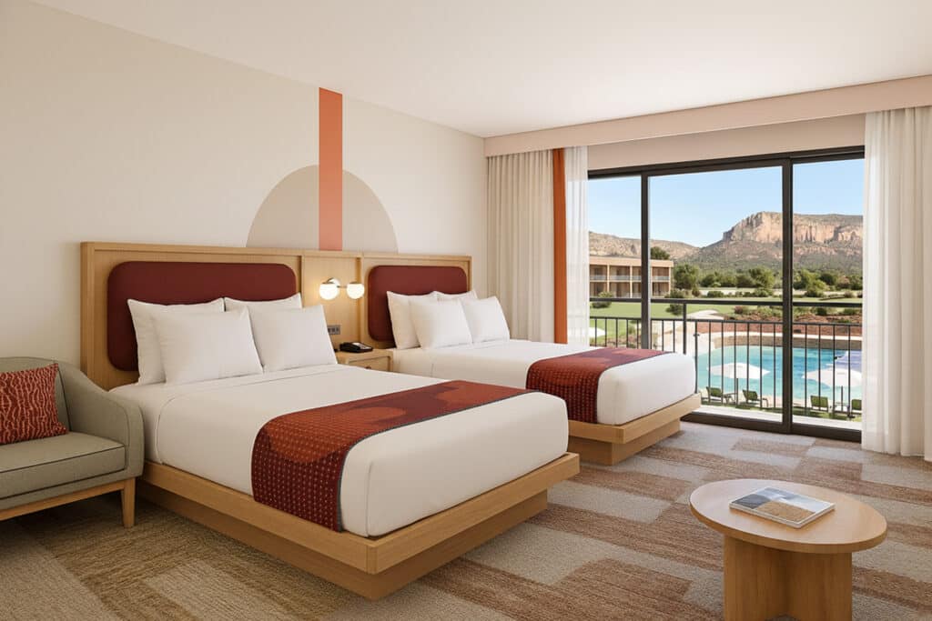 Take in Sedona’s golden light from above. The Pool Balcony Two Queen offers a private balcony with elevated views of the Moonwater Pool and surrounding red rocks. With two queen beds, modern finishes, and warm, nature‑inspired tones, this space is designed for rest and reconnection. Perfect for families or friends who want to soak in Sedona’s beauty while enjoying the easygoing rhythm of life at Outbound.
