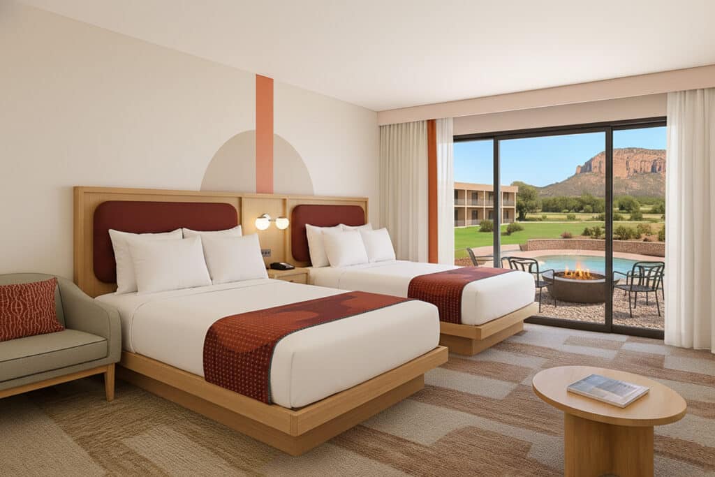 Sedona sunsets, firelight, and easy access to the pool—our Pool Patio Two Queen rooms bring it all together. Step from your private patio straight to the Moonwater Pool, or gather around your personal firepit as evening settles in. Designed with both comfort and connection in mind, these rooms feature two queen beds, rich textures, and earthy hues that echo Sedona’s landscape. Perfect for families or friends looking to stay close to the action while soaking in the resort’s laid‑back charm.