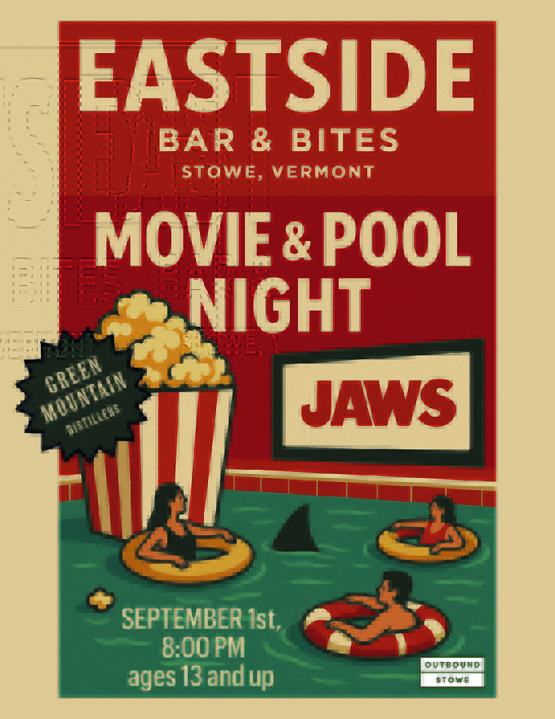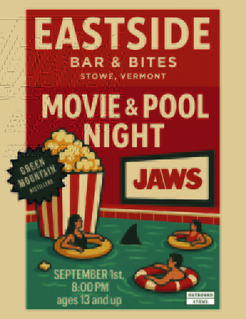 We’re ending summer with a splash. Grab a lounge chair or dip a toe in for a poolside screening of Jaws under the stars. Green Mountain Organic Distillers will be behind the bar with $10 “No Boat Accident” cocktails made with vodka, lemon, and fresh strawberry simple. We’ll also be pouring $5 Narragansett beers all night.