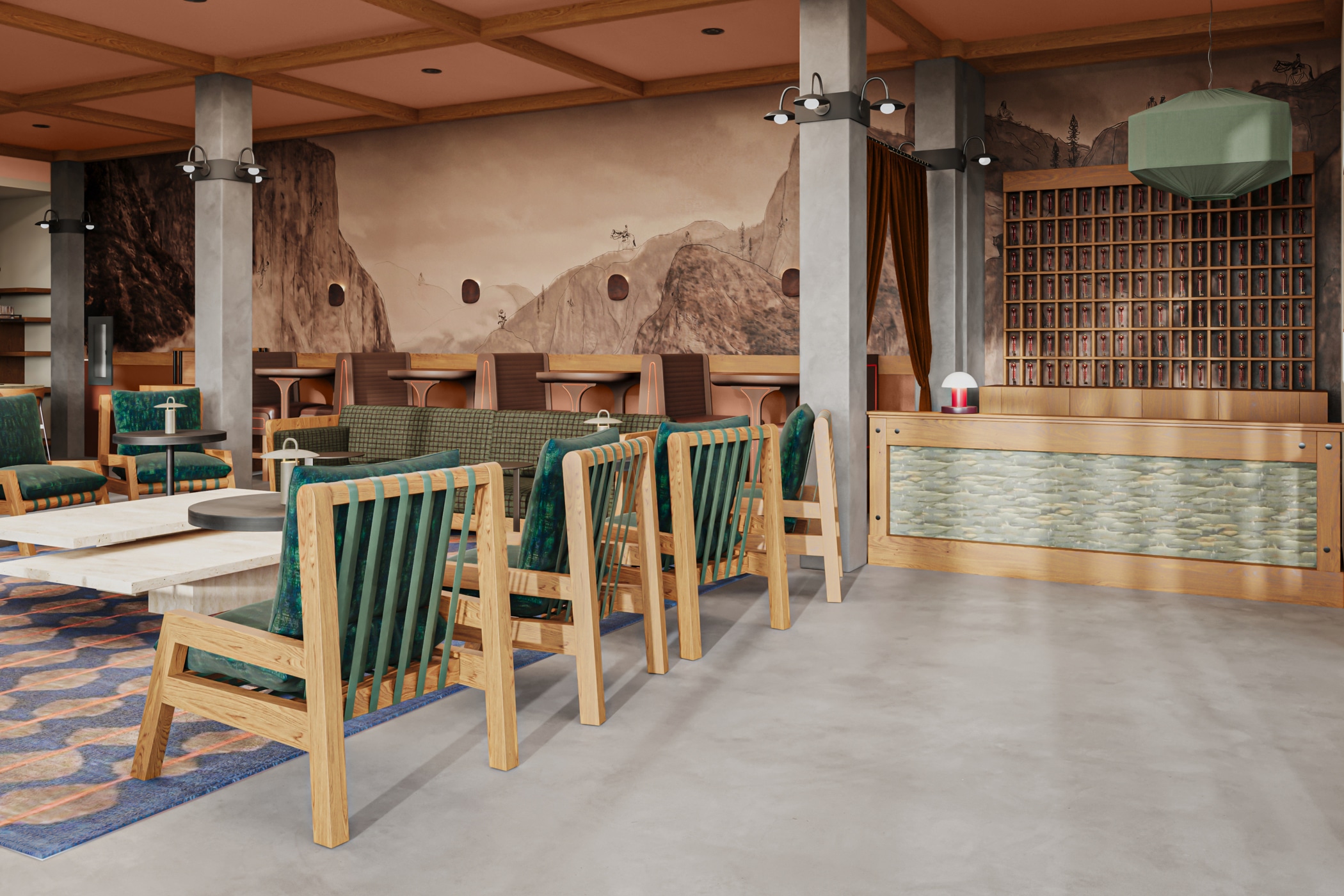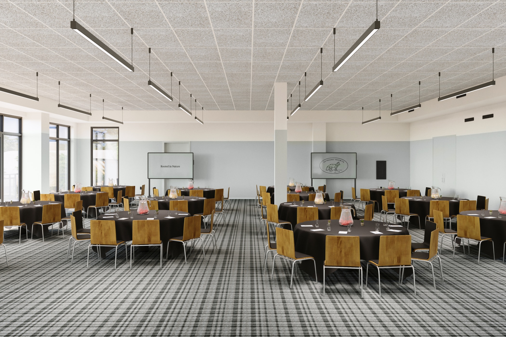 A warm, light-filled space blending natural textures and modern design. With comfortable lounge seating and a handcrafted bar, it’s perfect for cocktail receptions or relaxed gatherings at Outbound Yosemite.