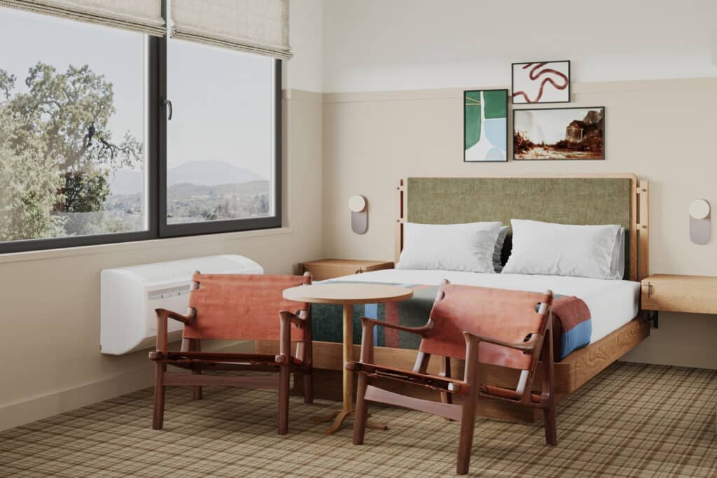 Settle into comfort in our Accessible Deluxe Lodge King room at Outbound Yosemite. This spacious room features a plush king-size bed, a comfortable sitting area, modern finishes throughout and an accessible bathroom with a roll-in shower, grab bars, bench, and handheld showerhead. Designed with simplicity and ease in mind, it’s the perfect place to unwind after a day of exploring Yosemite, just a short drive from the park’s South Gate.